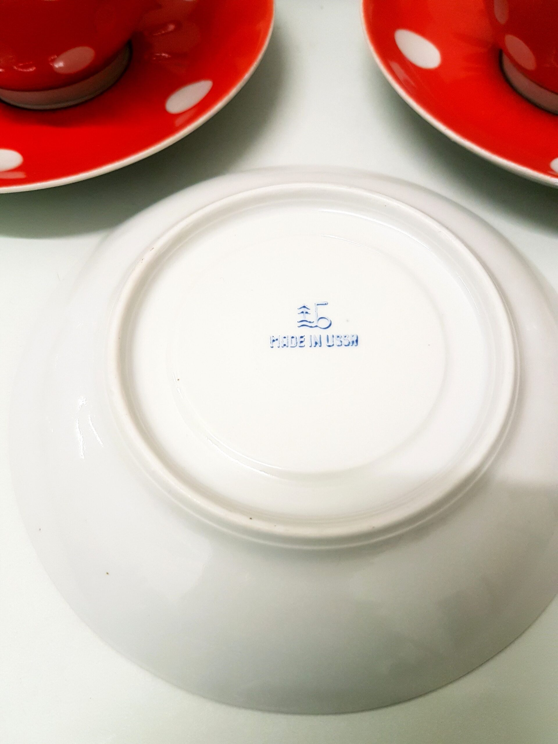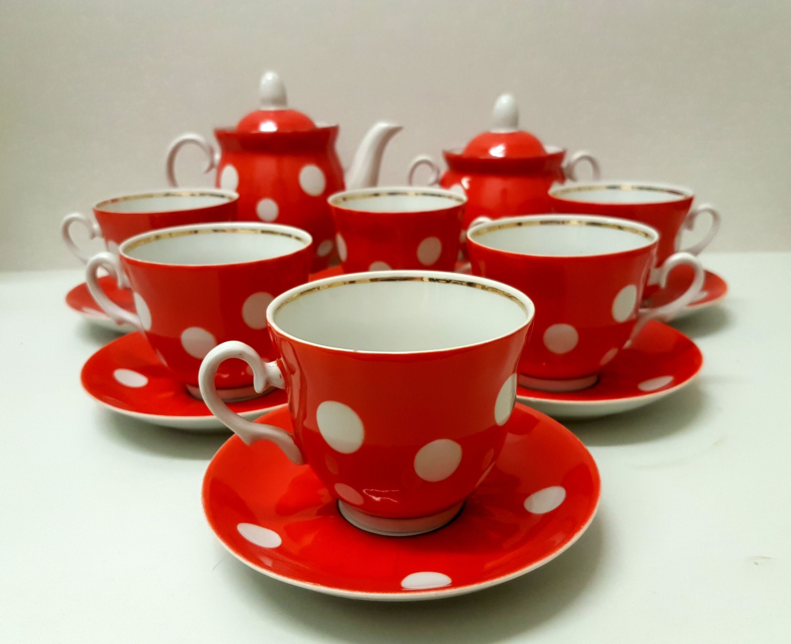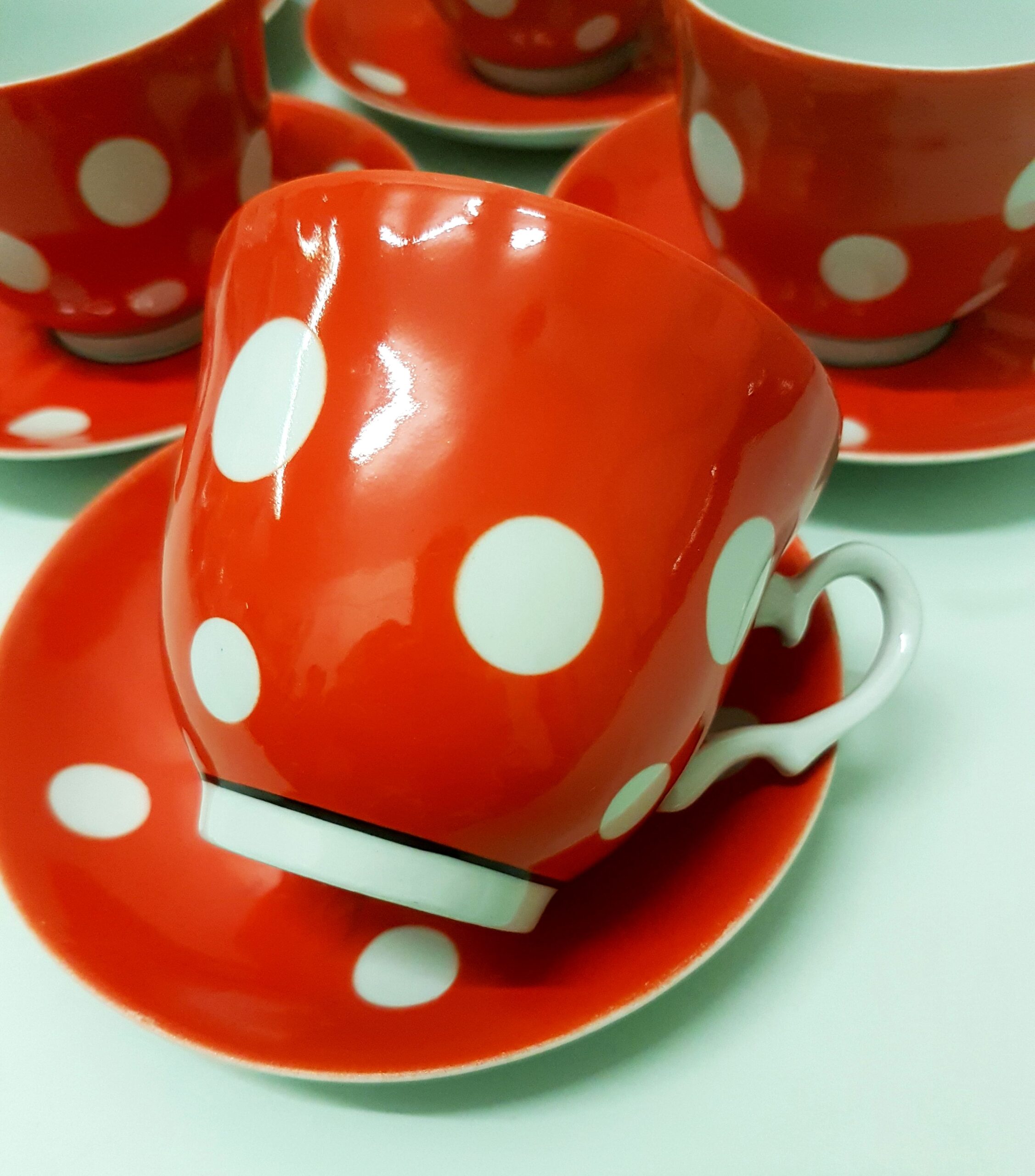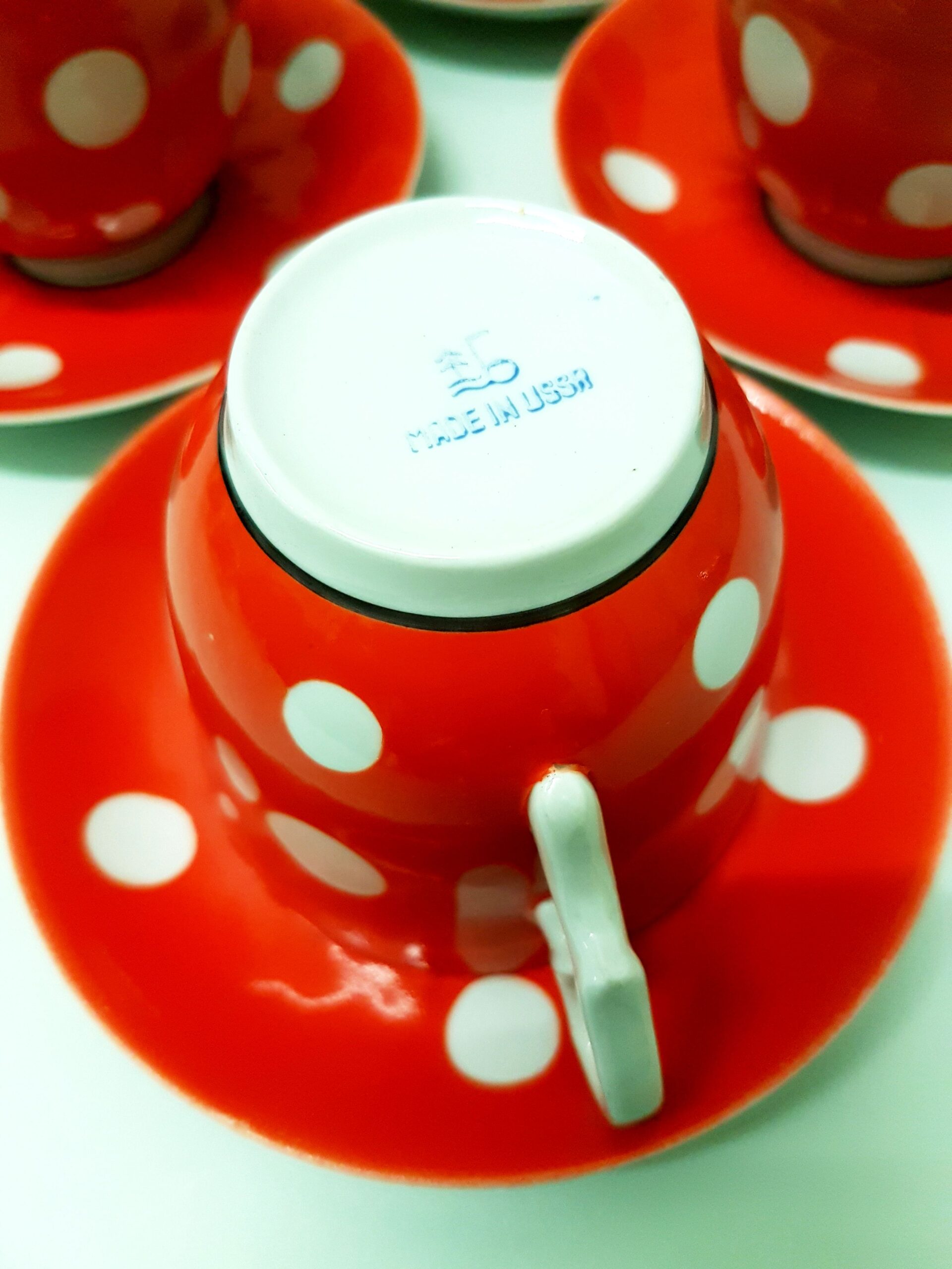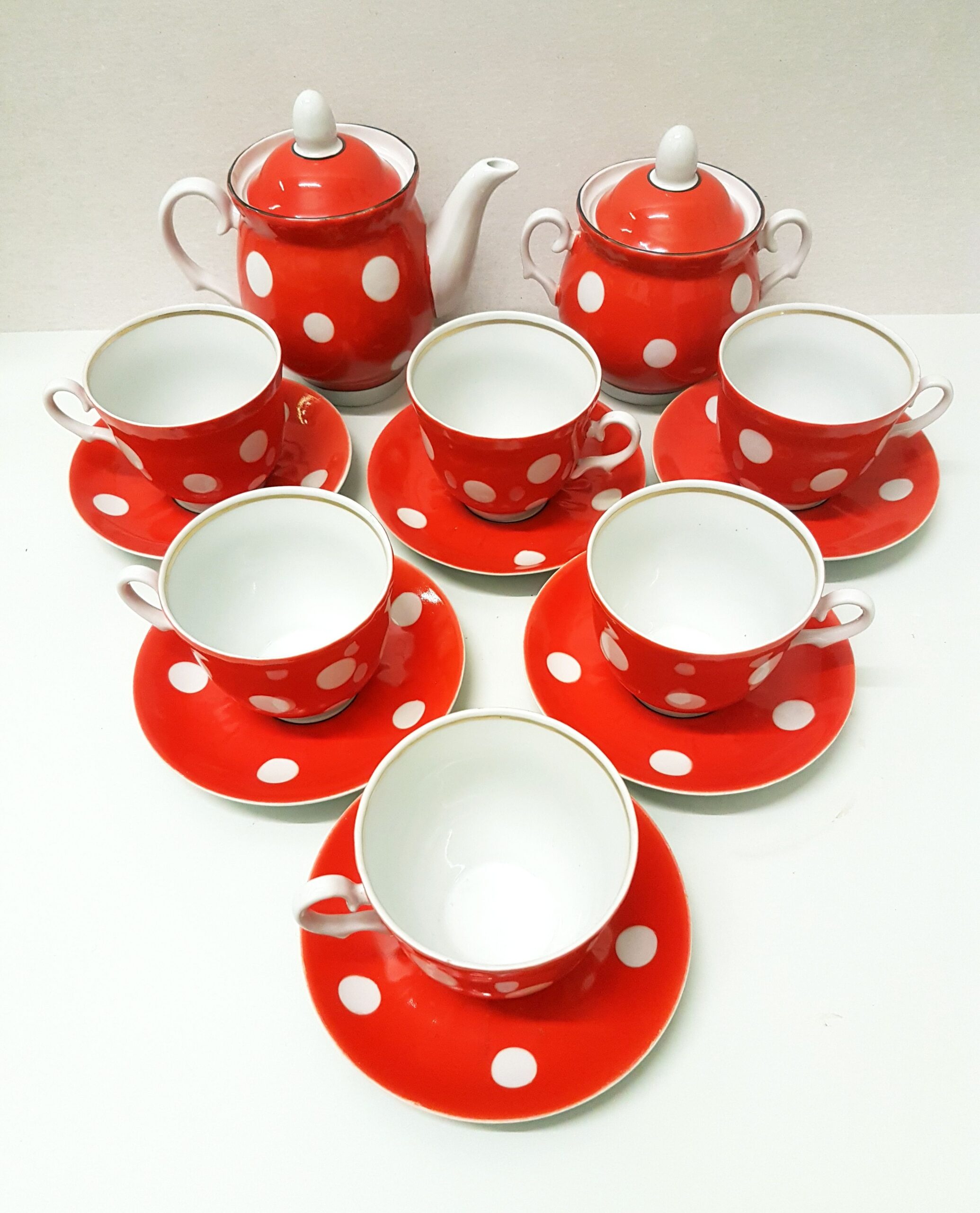 Čajový servis „Červené s puntíky“ USSR/ Baranovka, již neexistující porcelánka.
